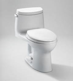 In a one-piece toilet, the bowl and tank are one piece rather than bolted together. The number one advantage is the elimination of potential leaks between the tank and the bowl. One of the most popular one-piece toilets is the TOTO UltraMax II, and it is available in several colors. This one features an elongated bowl for maximum comfort. Another is the Santa Rosa Toilet from Kohler, which provides a beautiful, contemporary space-saving design. Both of these work best in small to average-sized bathrooms.